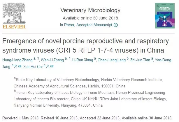 2018年6月30日,國(guó)際知名期刊Veterinary Microbiology(獸醫(yī)微生物)在線發(fā)表中國(guó)農(nóng)業(yè)科學(xué)院哈爾濱獸醫(yī)研究所動(dòng)物病原監(jiān)測(cè)與流行病學(xué)團(tuán)隊(duì)的最新研究,該團(tuán)隊(duì)在我國(guó)首次發(fā)現(xiàn)分支為ORF5 RFLP 1-7-4分支PRRSV的毒株。