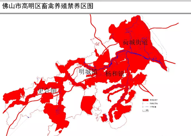 禁養區范圍:荷城街道、西江新城全街道,楊和、明城、更合三鎮人口集中區,主干河涌兩邊500米、主干河涌支流和其余河長制河涌兩邊200米范圍,水源保護區,主干道路兩旁100米范圍,在本次劃分中都被列入禁養區。