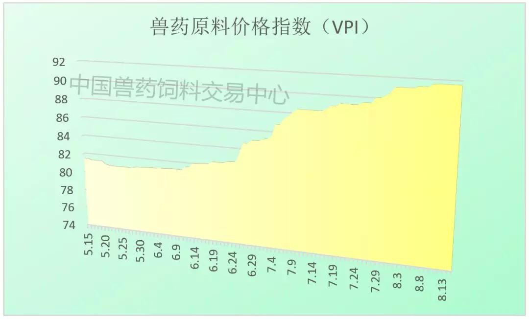 1、8月15日獸藥原料價格指數(VPI)91.65,并持續上漲,使用層面需求量逐步平穩,受環保、原料價格、例行停產檢修期等因素影響延續,獸用原料部分用量較大品種供應緊張,注意貨源把握。