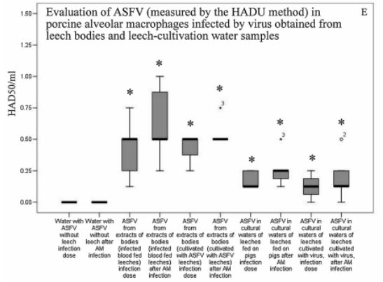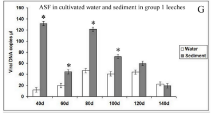 該研究進一步測試了水蛭實驗組攜帶的ASFV是否對豬具有感染能力,結果表明水蛭攜帶的ASFV通過口服途徑感染豬是可能的,但是這種現象不能被有規律的重復,特別是在實驗的后期階段。從口服感染到發病,豬的潛伏期為12-15天,這與臨床數據非常相似。