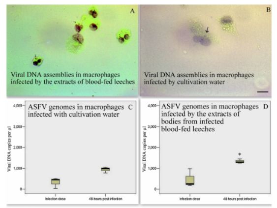 已有研究表明,非洲豬瘟病毒(ASFV)可通過水源傳播。截止目前,水被ASFV污染的源頭仍不清楚,其中一個可能的因素是感染豬的糞便和尿液。然而,在沒有合適寄生物的情況下,ASFV在水中存活時間一般只有數天,是不可能在水中長期存在的。因此,尋找可以攜帶和傳播非洲豬瘟病毒的水生生物顯得非常必要。在自然環境中,水蛭是細菌、病毒、寄生蟲的重要宿主。早在1913年,Boynton等已發現它在牛瘟的傳播中具有重要作用。后續研究也發現,水蛭是動物病毒的跨宿主傳播的載體之一。該研究對水蛭攜帶和分泌ASFV的能力進行了檢測,并對水蛭分泌的ASFV的感染能力進行了分析。
