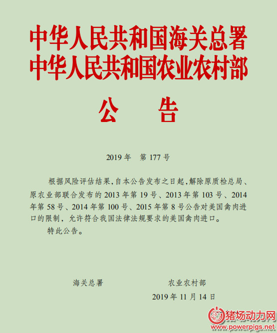 昨日,海關(guān)總署公告,根據(jù)風(fēng)險(xiǎn)評(píng)估結(jié)果,自本公告發(fā)布之日起,解除原質(zhì)檢總局、原農(nóng)業(yè)部聯(lián)合發(fā)布的2013年第19號(hào)、2013年第103號(hào)、2014年第58號(hào)、2014年第100號(hào)、2015年第8號(hào)公告對(duì)美國(guó)禽肉進(jìn)口的限制,允許符合我國(guó)法律法規(guī)要求的美國(guó)禽肉進(jìn)口。